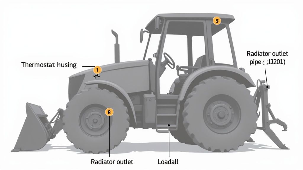 - JCB JS Excavators (e.g., JS200): This is where they get tricky. On many excavators, you’ll find the sensor on the radiator outlet pipe, not directly on the engine block.